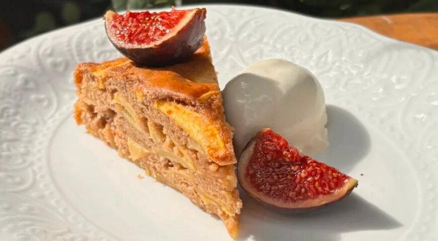 Для приготовления, взбейте яйца с сахаром до образования воздушной массы. Аккуратно добавляйте муку и остальные сухие ингредиенты, чтобы не потерять легкость теста. Яблоки нарежьте, соедините с тестом и выпекайте в заранее подготовленной форме при 180 °C около 30–40 минут. Удачным дополнением к десерту станет шарик любимого мороженого.
