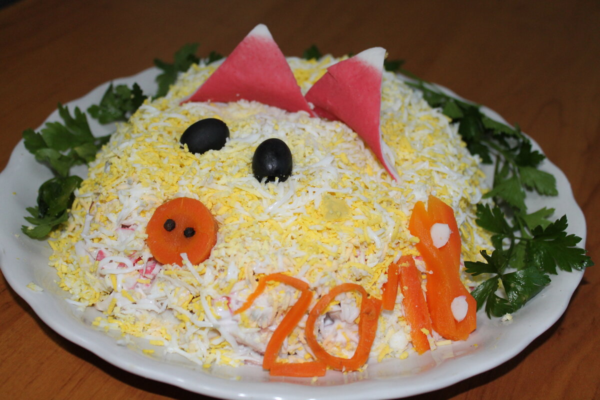 Не забудьте украсить салат зеленью или отварными овощами, чтобы добавить изысканности и свежести. Этот яркий и вкусный салат станет не только отличным дополнением к вашему новогоднему столу, но и ярким акцентом, который приятно удивит гостей. Приятного аппетита и удачи в Новом году!