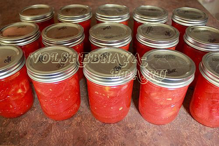 В стерилизованные банки укладывайте целые помидоры из первой группы. Далее заполните банки горячим соком, добавив по чайной ложке уксуса в каждую. Закройте крышками и стерилизуйте в кипящей воде в течение 10 минут. После этого банки переверните и закутайте в теплое одеяло, оставив их остужаться на сутки.