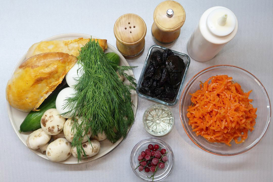 Приготовление начинается с нарезки шампиньонов на произвольные кусочки. На разогретую сковороду с растительным маслом выкладываются грибы, и они обжариваются до момента, когда испарится вся жидкость. Далее свежий огурец нарезается кубиками, а копчёная куриная грудка и чернослив — на небольшие кусочки.