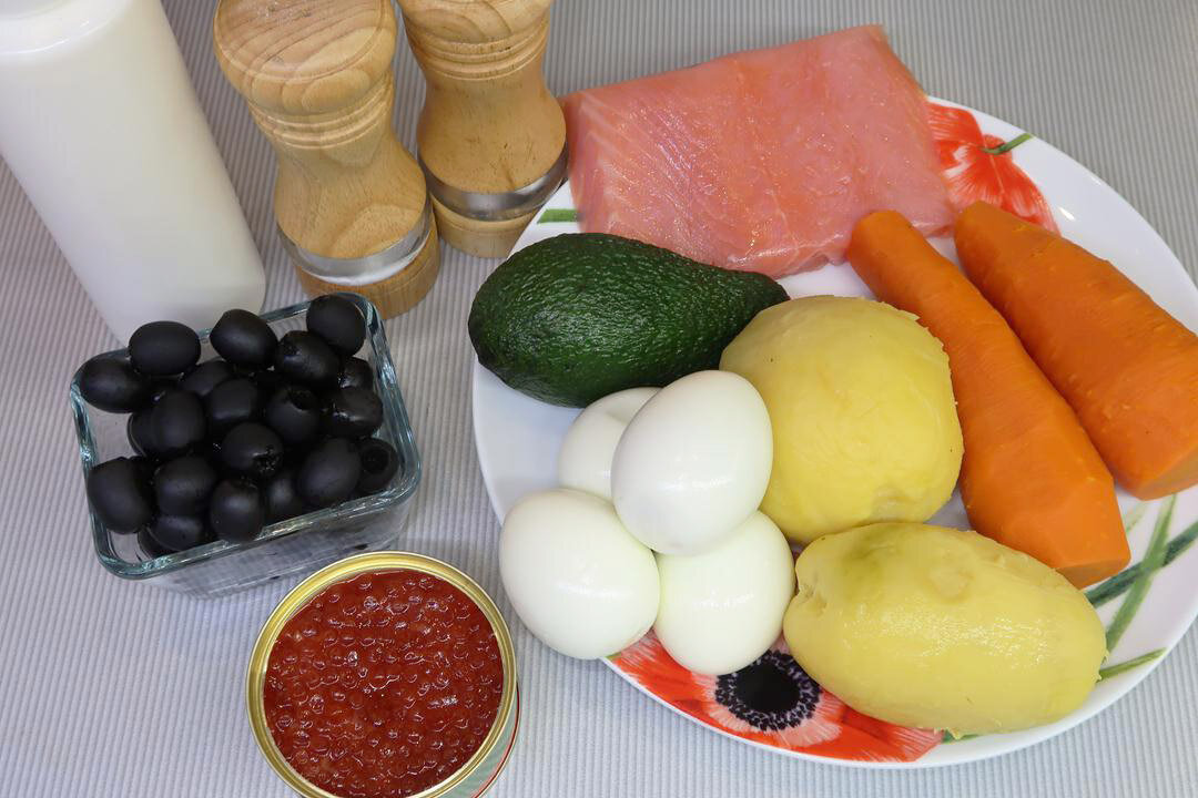 Для создания салата «Царский» с красной рыбой и икрой понадобятся следующие ингредиенты: