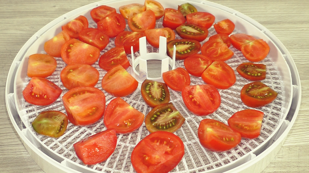 Перед началом необходимо промыть помидоры, удалить плодоножки и разрезать их пополам (для крупных плодов – на четвертинки). Затем выкладываем помидоры на противень, если планируется сушка в духовке, либо в сушилку – в этом случае результат будет отличным в обоих вариантах.