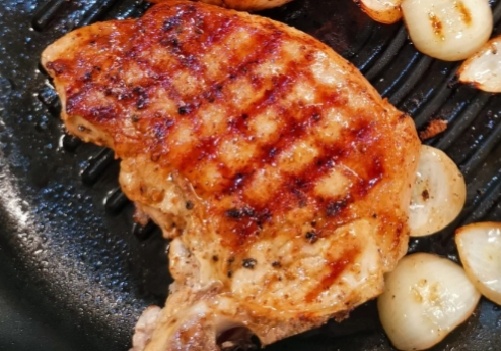3. Приготовление: Разогрейте сковороду-гриль на среднем огне. Обжарьте корейку сначала с мясистой стороны, затем по 4-6 минут с каждой стороны до образования румяной корочки. Завершите процесс в духовке при температуре 180°C на 15-25 минут.