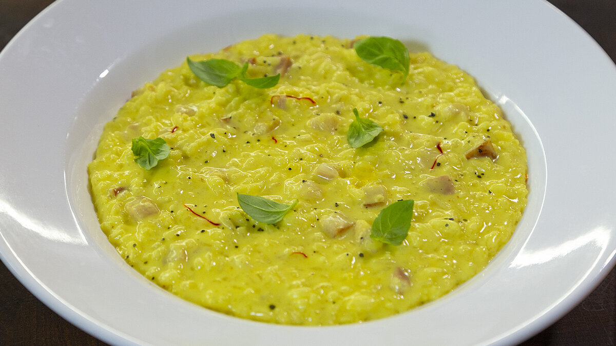 1. Начиная с нарезания мелкими кубиками лука, обжарить его на оливковом масле в глубокой кастрюле. Когда лук станет золотистым, добавить рис и обжаривать 1-2 минуты. 2. Влить белое вино и немного увеличить огонь, затем добавить куриный бульон, перчить по вкусу и тщательно перемешать. Ввести шафран и посолить. 3. Когда рис будет наполовину готов, нарезать копчёную грудинку и добавить в кастрюлю. Затем влить 100 мл сливок и немного бульона, чтобы ризотто оставалось слегка жидким. 4. Довести до кипения, попробовать и, когда рис станет нежным, снять с огня. Добавить кусочек сливочного масла и одну столовую ложку плавленого сыра, тщательно перемешать.