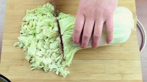 1. Начать стоит с нарезки пекинской капусты на произвольные кусочки.