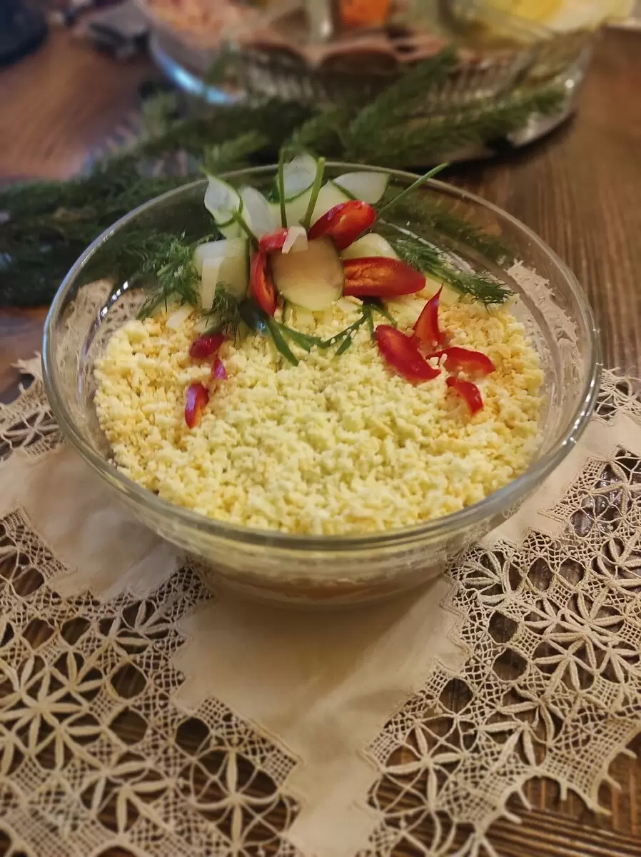 - Завершаем слои натертыми желтками, которые служат не только для вкуса, но и для украшения.
