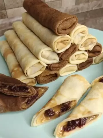 В процессе выпекания на светлый или шоколадный блин можно смело укладывать варёную сгущёнку и вишню, свернув их в трубочку или конверт. В результате получатся мягкие и нежные блинчики, которые идеально подойдут для сладкой начинки.