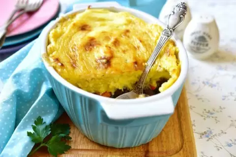 - В форму для запекания положить половину картофельного пюре, затем слой мясной начинки и сверху закрыть оставшейся частью пюре. Для украшения можно нанести узор вилкой.