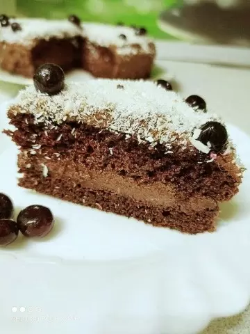 Когда бисквит полностью остынет, его разрезают на две части. Коржи слегка пропитывают сладкой водой с добавлением эритрита. Один из коржей смазывают кремом, затем накрывают вторым и обмазывают оставшимся кремом. Последний штрих - украшение кокосовой стружкой и ягодами.