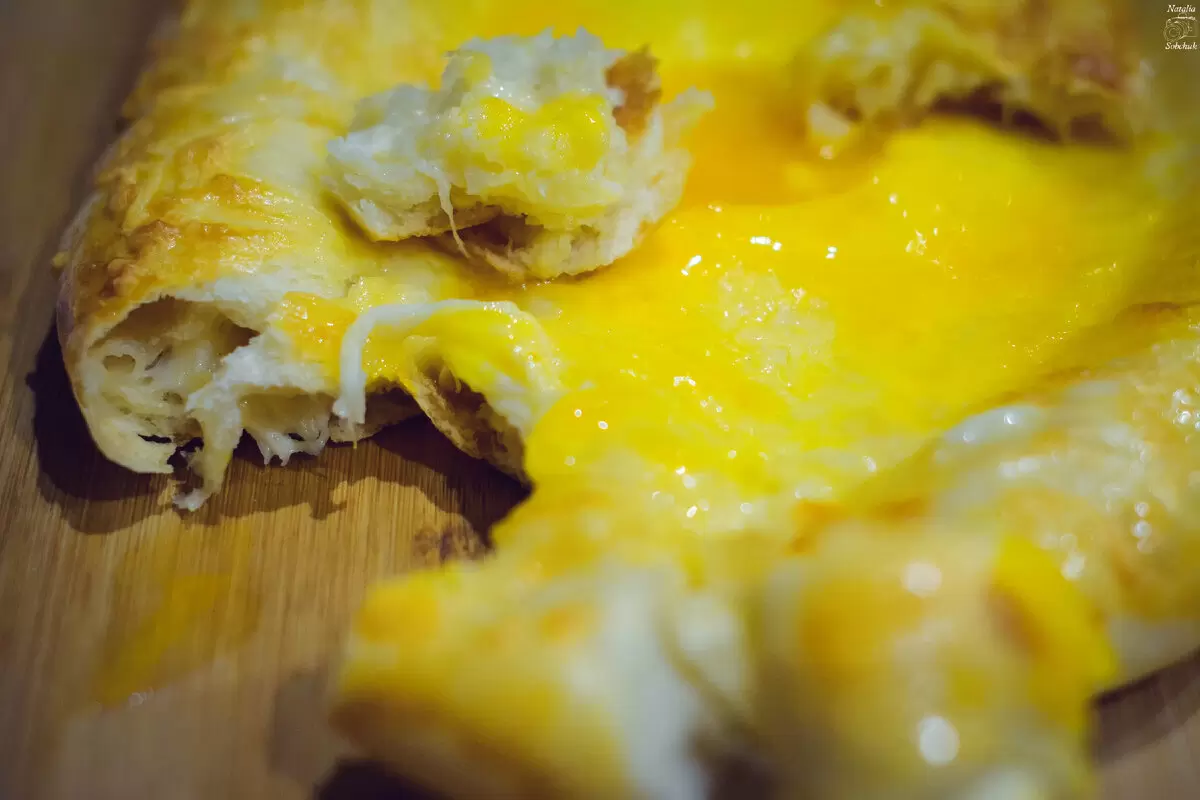 Когда тесто подойдет, разделите его на две части. Каждую раскатайте в круг толщиной 4-5 мм. Вдоль краев теста распределите сырную начинку и аккуратно заверните, формируя лодочку. В середину поместите оставшуюся начинку, края смажьте желтком. Выпекайте в разогретой до 220° духовке 15-20 минут до золотистой корочки. Затем в серединке сделайте углубление, добавьте сырой желток и кусочки сливочного масла, верните в духовку на 2 минуты. Хачапури готово!