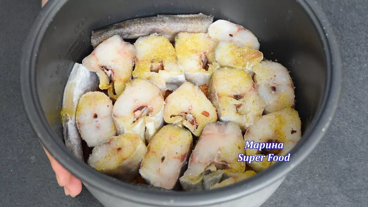 5. На овощную подушку разместить кусочки морепродукта, приправить их солью и специями для рыбы.
