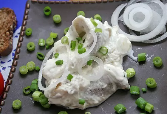4. Полить соусом подготовленную сельдь и сразу подавать к столу, украсив блюдо оставшейся зеленью.