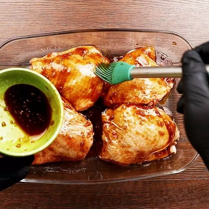 Получившимся маринадом щедро полейте куриные бедра, не забыв вылить остатки в форму к ним. Разогрейте духовой шкаф до 200 градусов Цельсия. Накройте форму с бедрами фольгой и поставьте в духовку на 30 минут.