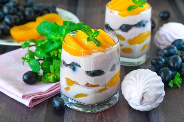Шаг 5: Выровнять десерт можно в стаканах или креманках. На дно выкладывается немного крема, затем добавляются нарезанные персики и виноград. Сверху повторно распределяется крем. Украсить десерт ломтиками персиков и свежей мятой. Первоначально продукты распределяются в три порции, после чего десерт следует оставить в холодильнике на 20 минут.