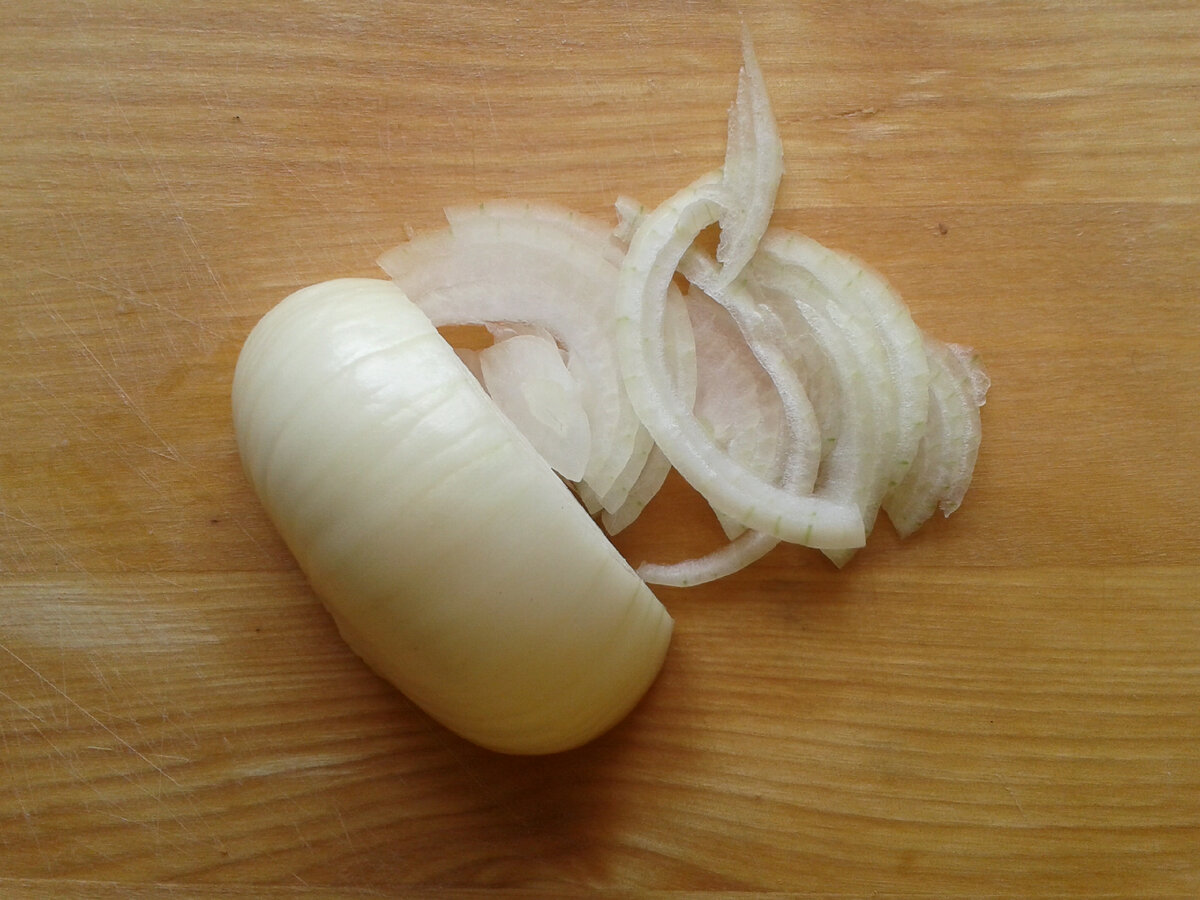 Следующий шаг – нарезка половины луковицы на тонкие полукольца. Если лук слишком острый, его можно обдать кипятком, чтобы уменьшить жгучесть, после чего слить воду и оставить до подсыхания.