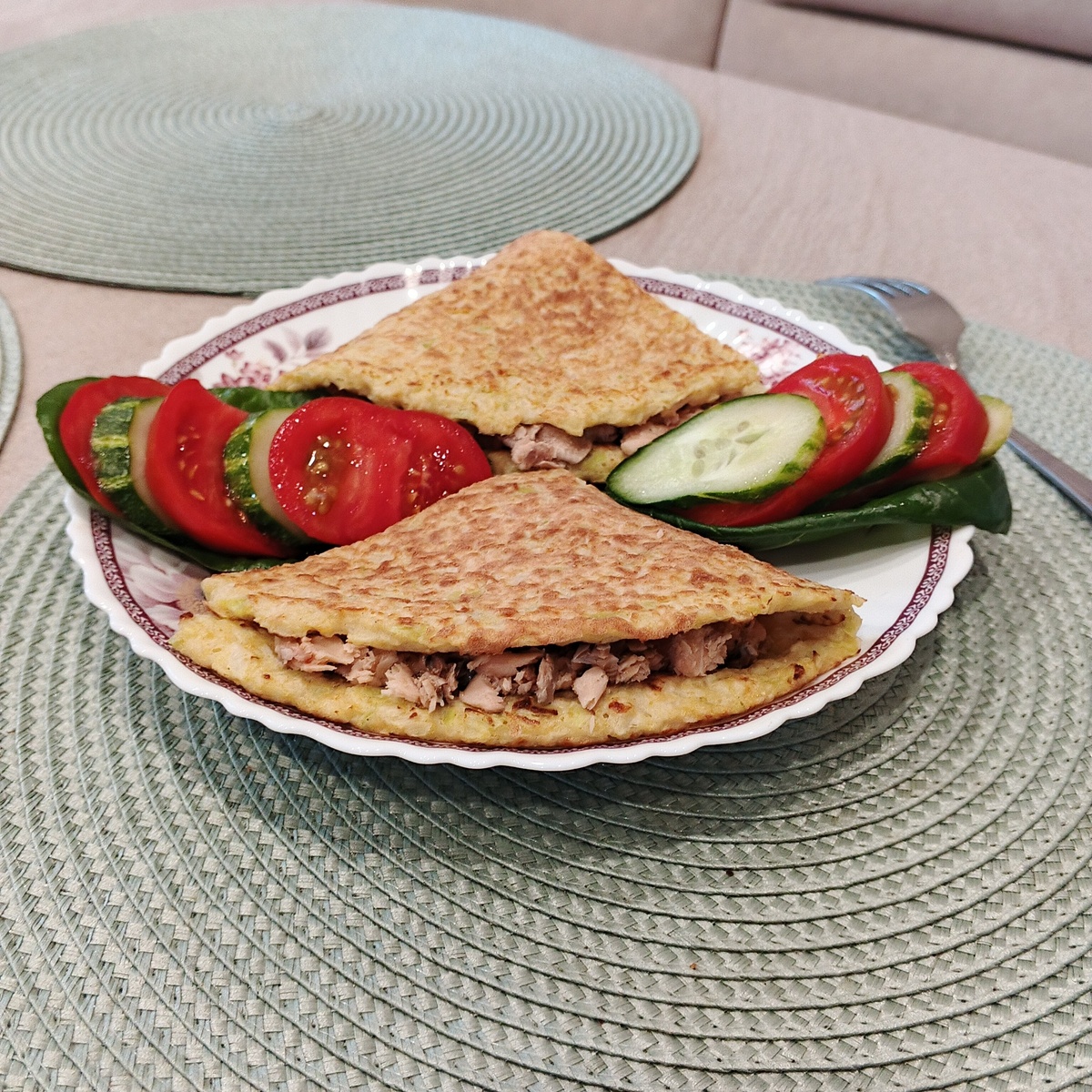 Приготовление: Все ингредиенты смешать и вылить тесто на разогретую сковороду. Готовить на среднем огне под крышкой до золотистой корочки, затем добавить начинку и довести до готовности.