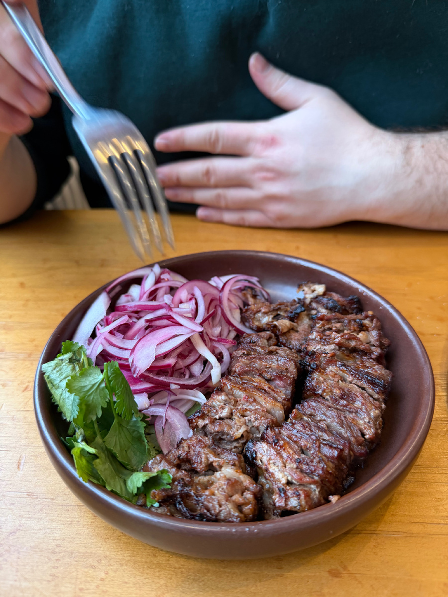 Меню пролетело как сон, и выбор был очевиден. Шашлык из говядины был признан настоящим шедевром: сочный и ароматный, он стал настоящим удовольствием. Гармония специй позволила раскрыться вкусу мяса, делая его главным действующим лицом на тарелке.