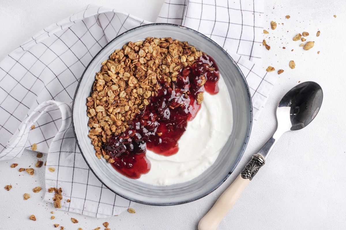 Шаг 2: В качестве подачи на тарелки выложите йогурт, затем посыпьте гранолой и полейте соусом. Подавайте немедленно, чтобы насладиться свежестью компонентов.