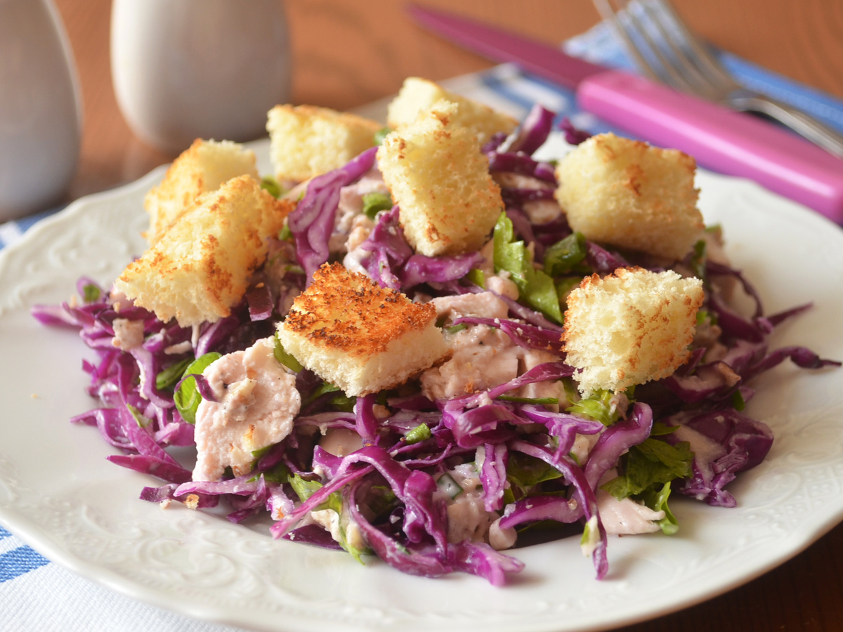 На первый взгляд, список ингредиентов выглядит просто: куриное мясо, капуста, орехи и сухарики. Но подключив этот удивительный соус – с чесноком, бульоном и майонезом, салат становится совершенно другим. Он объединяет все компоненты в вкусную симфонию: пикантную, немного острую, с глубокими ореховыми нотами. Такой салат идеально подойдёт как для ужина, так и для праздничного стола, а также прекрасно впишется в ланч-бокс. Его можно легко приготовить заранее, подать к застолью или взять с собой в контейнер – универсальный вариант на любой случай жизни.