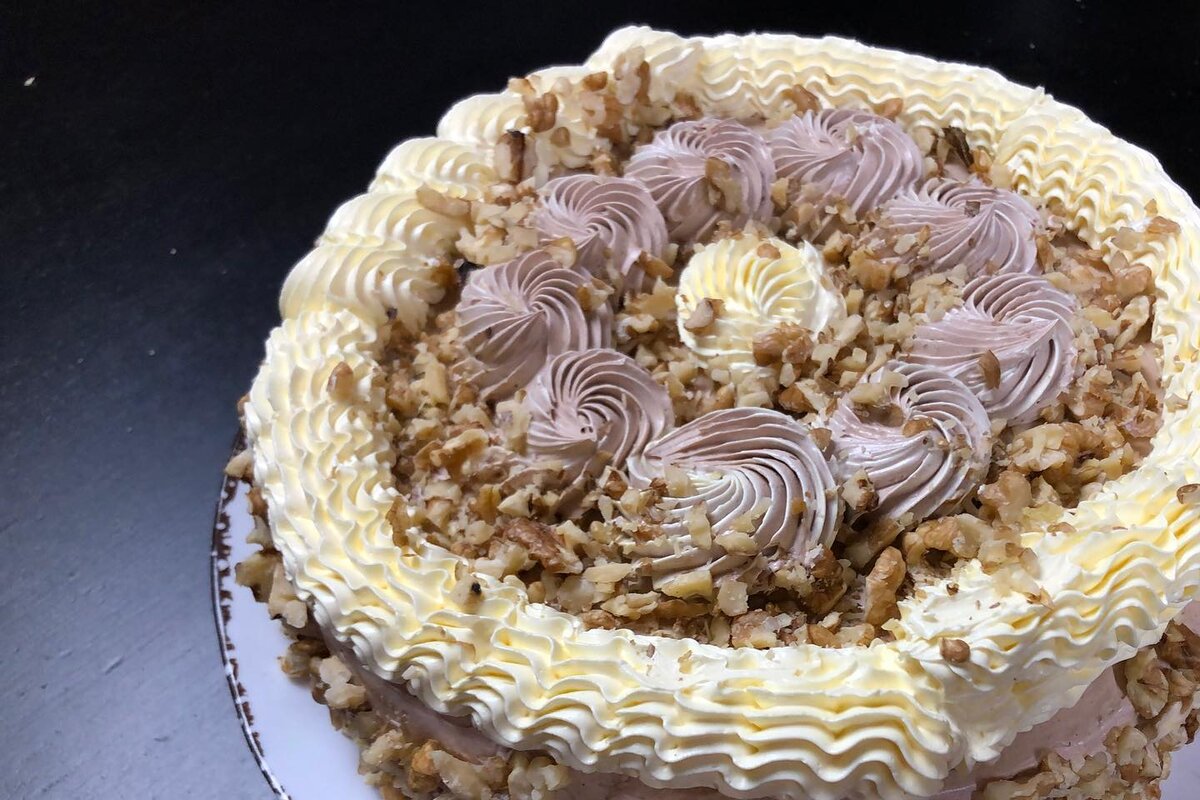 На завершающем этапе торт украшают по желанию: сторонам придают текстуру с помощью рубленых орехов, а верх покрывают белым кремом, используя кондитерский мешок. Иногда стоит дать торту немного охладиться перед подачей — это укрепит структуру.