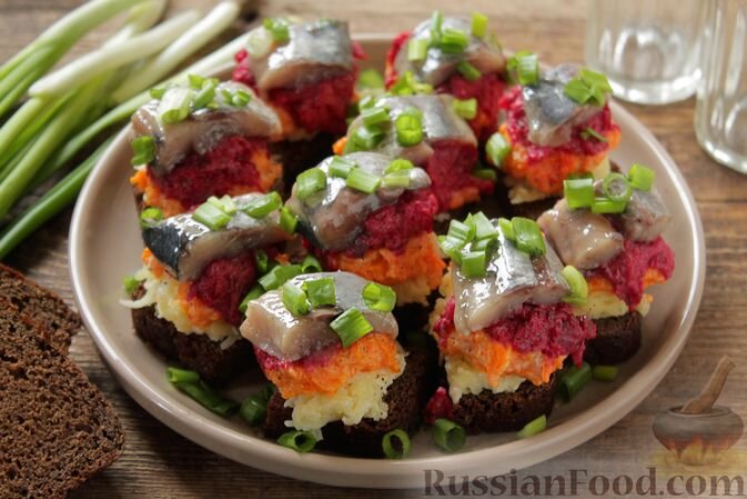 Для фуршетной вечеринки прекрасно подойдут канапе «Сельдь на шубе». Комбинация отварного картофеля, моркови и свеклы на кусочке ржаного хлеба, а сверху — ломтик селедки и свежий зелёный лук создаёт атмосферу праздника в каждом укусе.