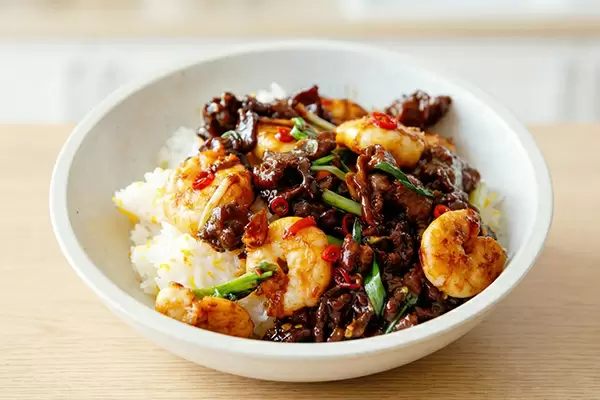 В китайской кухне белковые продукты предпочитают заниматься своим делом раздельно. Свинина дружит с фасолью, говядина отлично подходит к сельдерею или горошку, а креветки, как правило, одиночки, готовятся с луком и чесноком. Соединение говядины и креветок в одном блюде создает настоящий вызов: продукты отличаются по времени и температуре приготовления, что делает такое сочетание интригующим, но сложным.