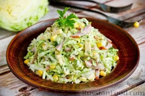 Салат из молодой капусты, ветчины, сыра и кукурузы — это настоящая находка. Хрустящие листья капусты идеально гармонируют со сладостью кукурузы и нежностью сыра, а ветчина добавляет содержательности. Готовится он мгновенно и исчезает с тарелки еще быстрее!