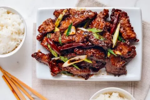 Нарезать говядину тонкими ломтиками по 3-4 мм, поперек волокон.Добавить ингредиенты для маринада, тщательно перемешать и оставить мариноваться на 60 минут.Имбирь и чеснок мельчить, а лук нарезать крупно, разделяя белую и зеленую части.Приготовить суспензию, смешав 1,5 ст. л. кукурузного крахмала с парой ложек воды.В отдельной миске объединить все ингредиенты для соуса.Перед обжариванием обвалять маринованные кусочки говядины в кукурузном крахмале, чтобы они были полностью покрыты.Разогреть ? стакана растительного масла на сильном огне. Проверить готовность масла, опустив бамбуковую палочку — если появляются пузырьки, масло нагрелось достаточно. Обжарить говядину небольшими партиями до хрустящей корочки, переложить на тарелку.Слить излишки масла, оставив 1 ст. л. Уменьшить нагрев до среднего, добавить имбирь и сушеный перец чили (по желанию, разломать их для остроты). Через 15 секунд добавить чеснок и белую часть лука, а еще через 15 секунд влить подготовленный соус.Вкусное завершение