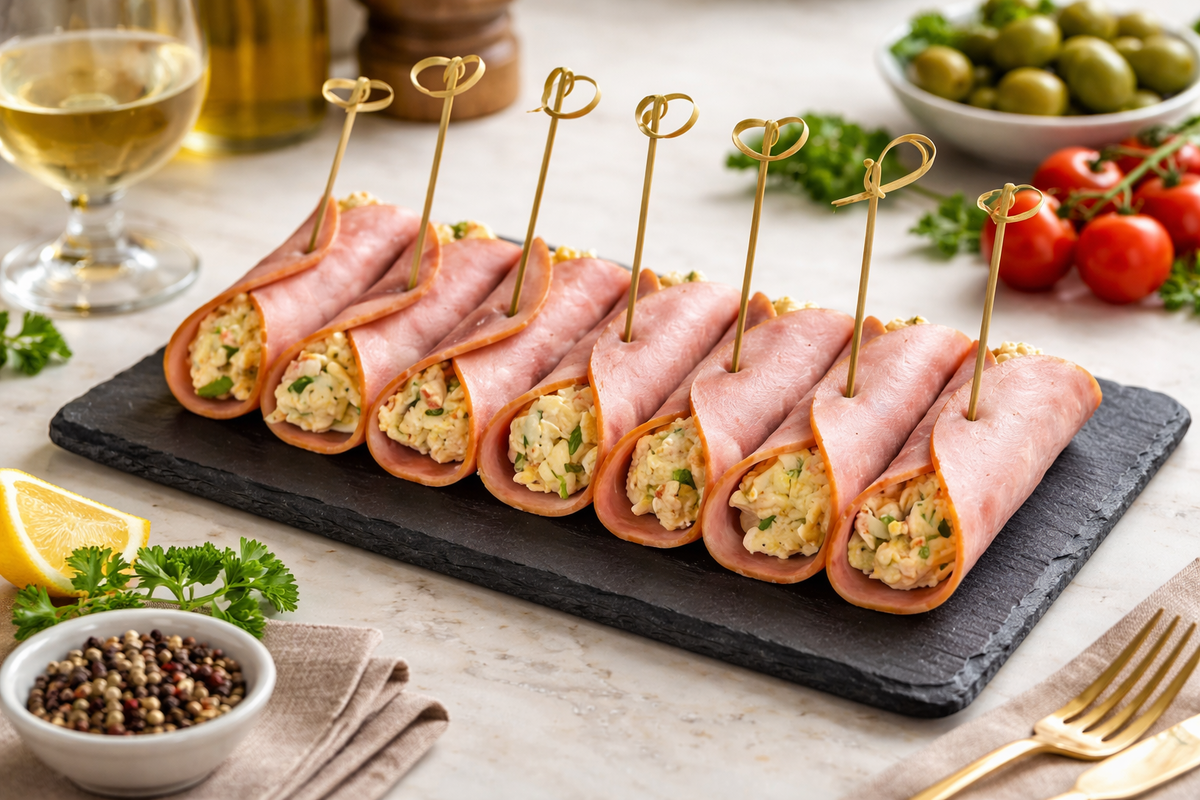 10. На плоской тарелке или разделочной доске разместите слайсы ветчины. На каждый ломтик выложите столовую ложку начинки, распределяя её вдоль.